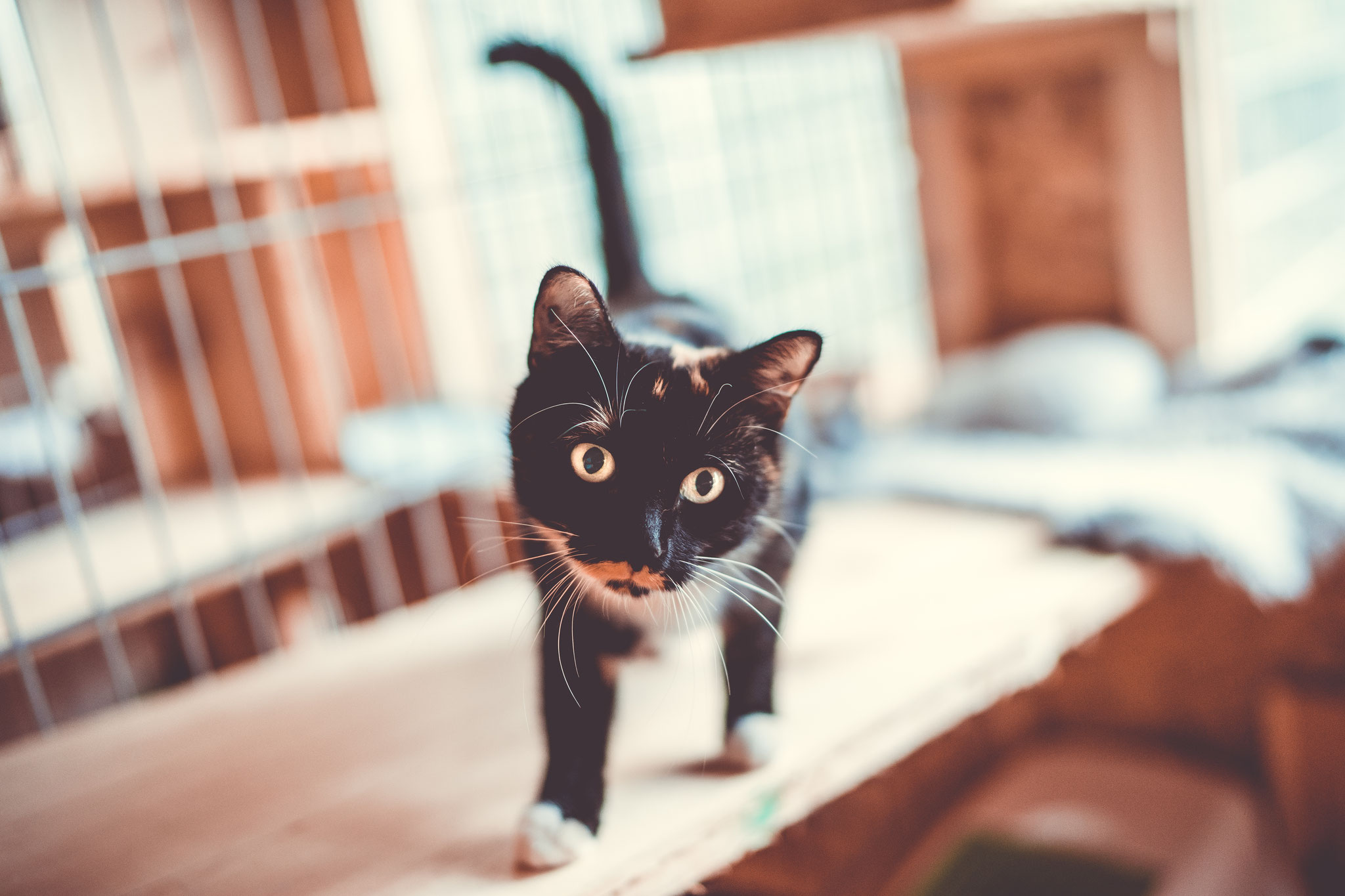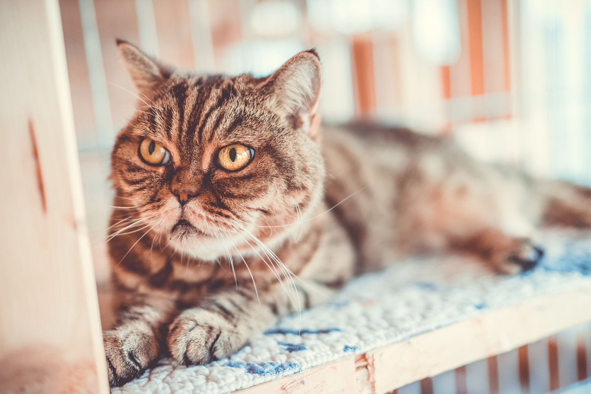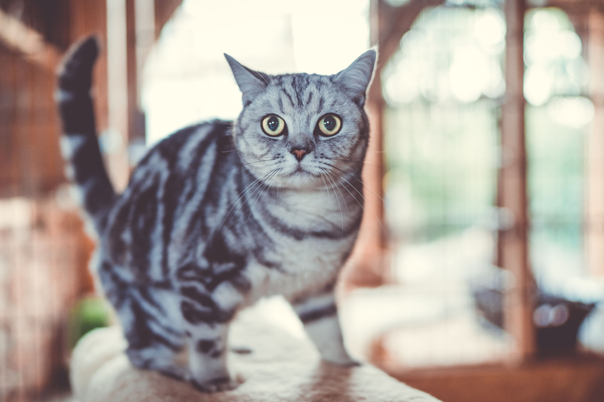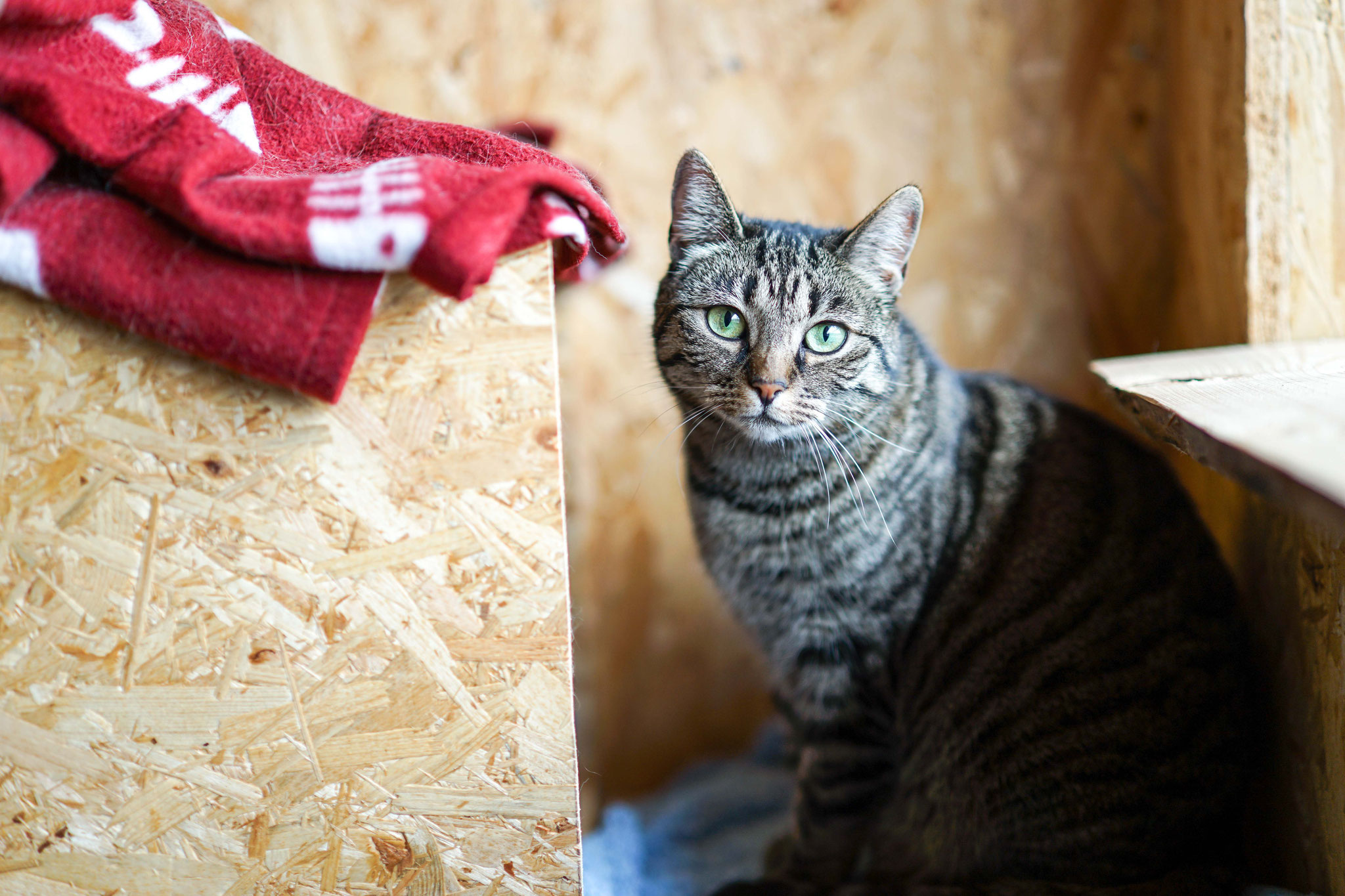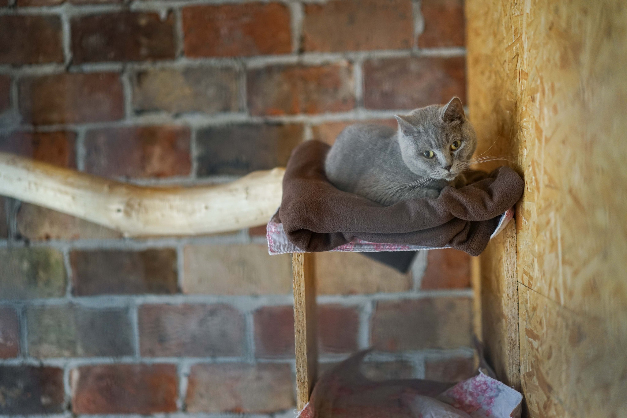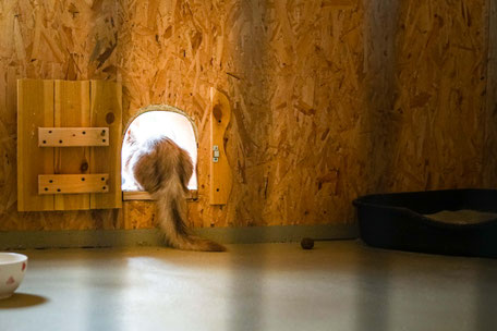 Die individuell gestalteten Zimmer haben dreidimensionale Liege- und Spielmöglichkeiten. Unsere naturbelassenen Materialien laden zum Krallenwetzen und zum Herumtoben nach Lust und Laune ein. Jede Katze hat die Möglichkeit selbst zu entscheiden, geht sie durch ihr eigenes kleines Mäuseloch raus ins Außengehege oder macht sie es sich gemütlich am eigenen Fenster im kuschelweichem Körbchen.